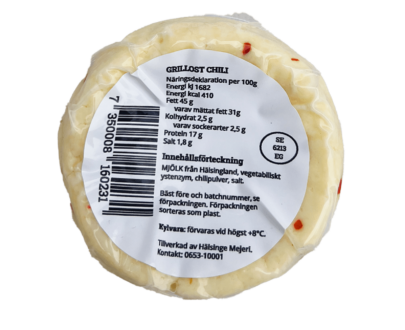 Extra god stek och grillost av mjölk från gårdar i Hälsingland . Tillverkad av Hudik Deli AB för Dellenmejeriet AB