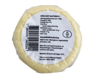 Extra god stek och grillost av mjölk från gårdar i Hälsingland . Tillverkad av Hudik Deli AB för Dellenmejeriet AB