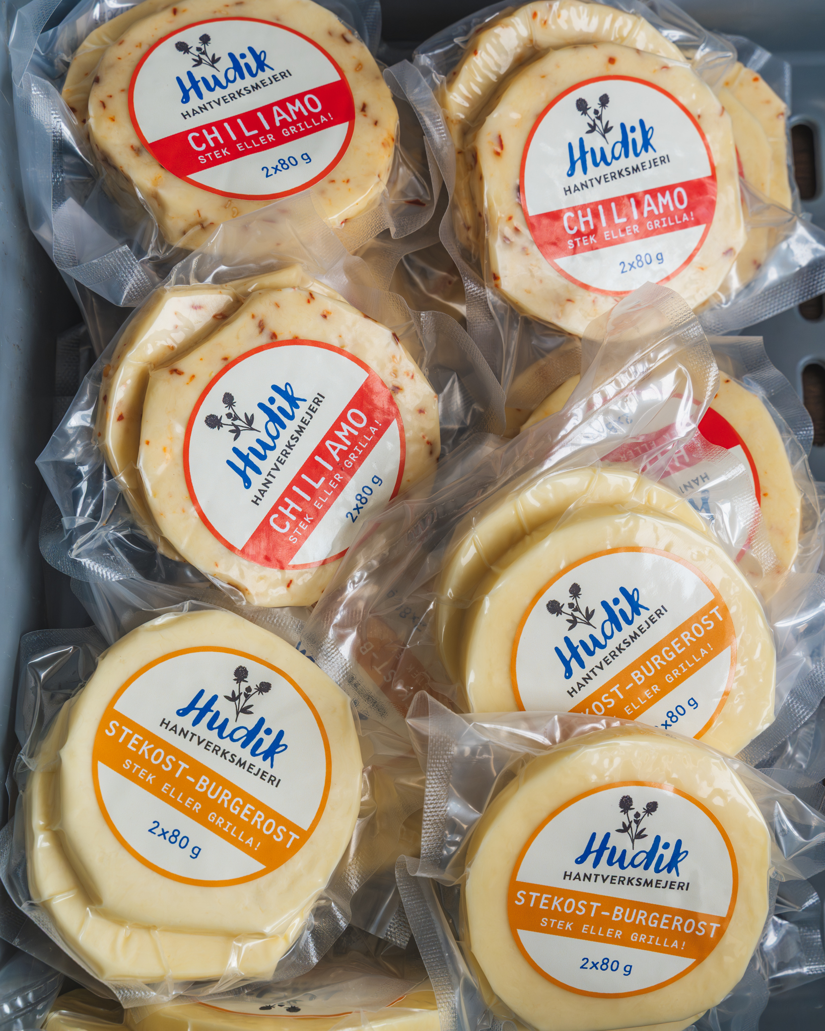 Mix låda med 25 pkt 2x80g med grillost burgare naturell och 25pkt 2x80g med grillost burgare med chilli