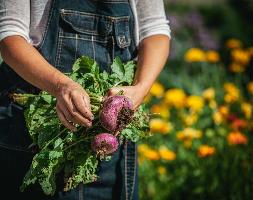 Grönsaker som odlats enligt ekologiska principer av småskaliga odlare i Hälsingland.