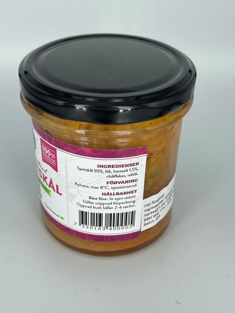 Naturligt fermenterad produkt på grönsaker från odlingar i Hälsingland och Gästrikland. Ingredienser: spetskål 93%, 1,5% havssalt, lök, chiliflakes, vitlök
